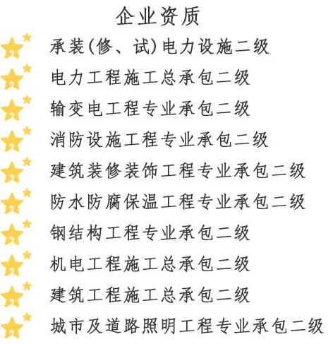 金楓電力集團有限公司,成立于2015年5月28日,注冊資金6060萬元,是一家專業從事電力工程施工的集團化公司。公司經營范圍包括:電氣安裝服務;建設工程施工;輸電、供電、受電電力設施的安裝、維修和試驗;測繪服務;建筑勞務分包;建筑工程設計;發(fā)電機及發(fā)電機組制造;建筑工程機械與設備租賃;工業工程設計服務;技術服務、技術開發(fā)、技術咨詢、技術交流、技術轉讓、技術推廣等。公司持有國家能源局頒發(fā)的承裝(修、試)電力設施許可證,承裝類二級、承修類二級、承試類二級資質;電力工程施工總承包二級資質;輸變電工程專業承包二級資質;建筑裝修裝飾工程專業承包二級資質;消防設施工程專業承包二級資質;防水防腐保溫工程專業承包二級資質;施工勞務資質;機電工程施工總承包二級;建筑工程施工總承包二級;城市及道路照明工程專業承包二級;鋼結構工程專業承包二級資質;公司已通過質量管理體系認證、環(huán)境管理體系認證及職業健康安全管理體系認證。并獲得省級信用評價AAA證書;連續(xù)多年納稅信用評價A級。